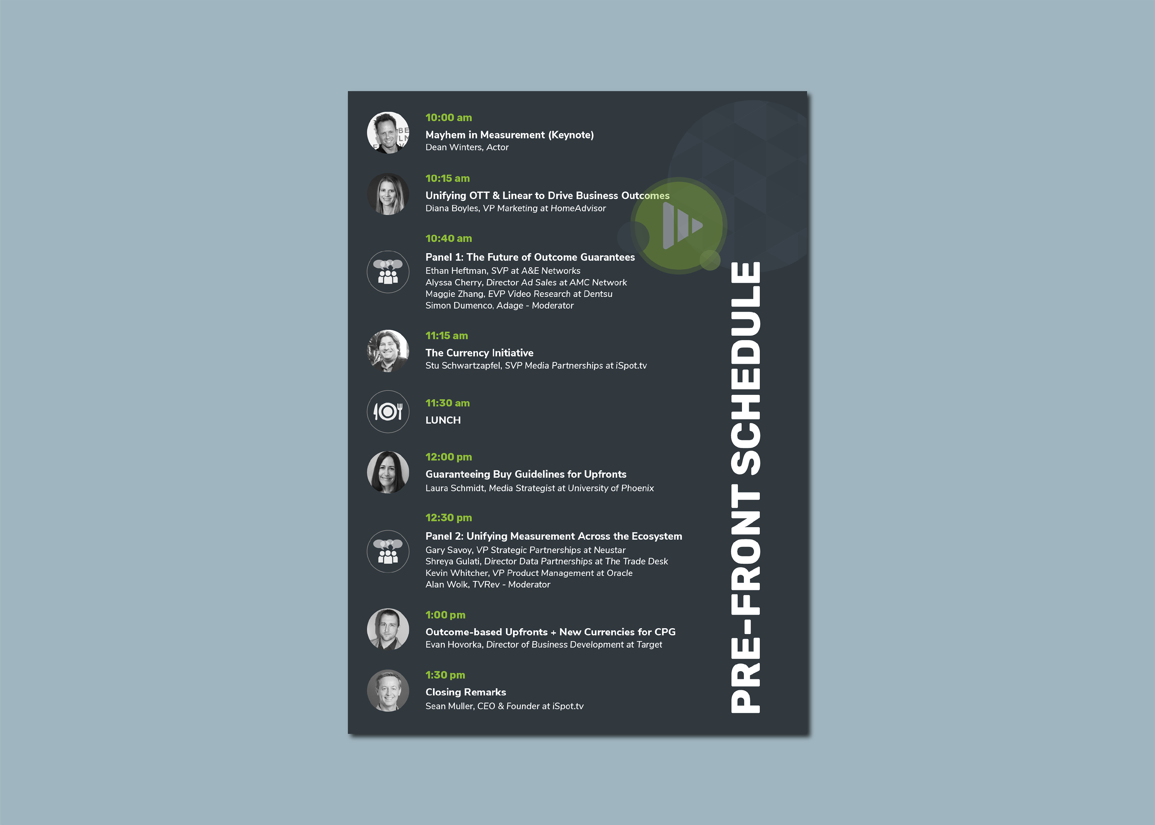 For iSpot.tv's 4th Annual Pre-Front, I updated the logo as well as put together the ID card design and event agenda.